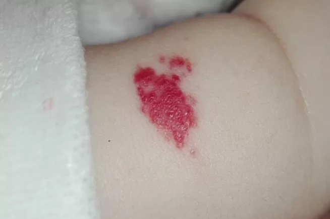 イチゴのように鮮やかな赤いあざがぷっくりと突出している。平坦・皮膚の下に青くすけて見えるなどバリエーションがある |